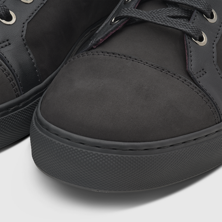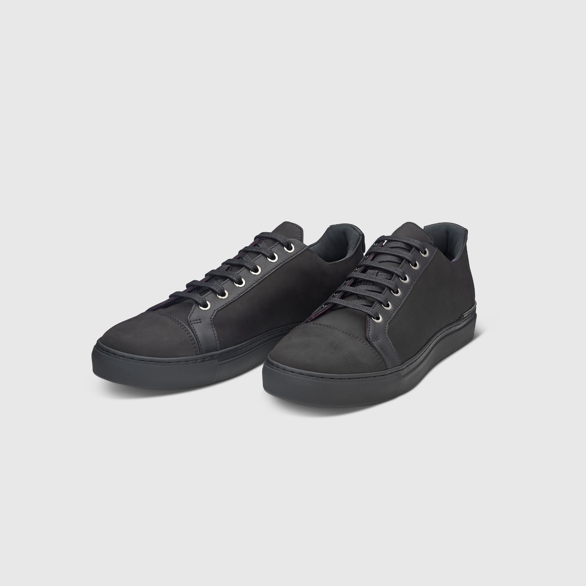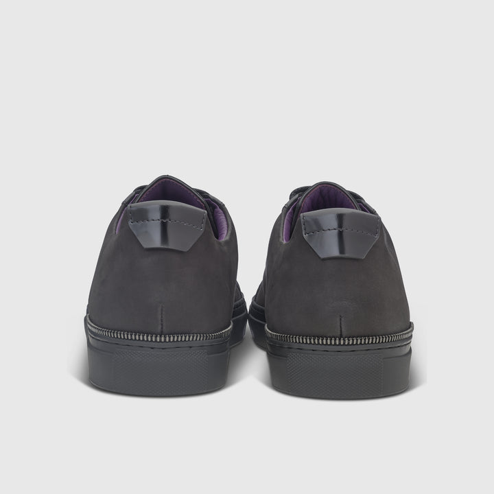 Low laced sneakers in black nubuck leather. Inside with purple details and an embossed octagon. Outer sole in black rubber.