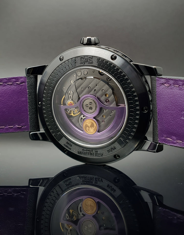 The design is elevated by Martin Key’s signature octagon on an 18k gold beveled index ring, accented with striking purple and black diamond hour markers. Each uniquely patterned dial is complemented by a back engraving of Key’s iconic zipper design, celebrating a perfect blend of innovative artistry and timeless craftsmanship.