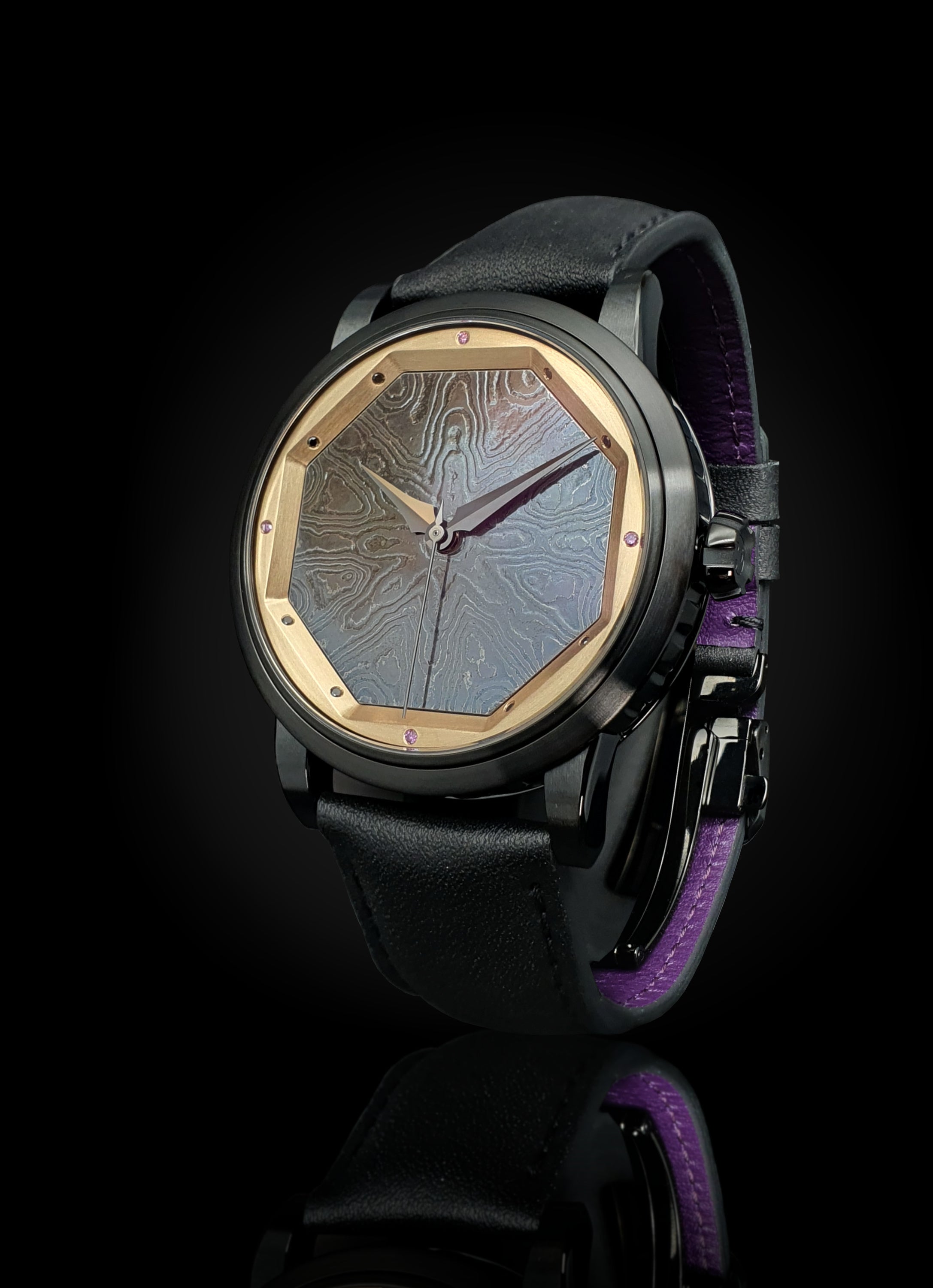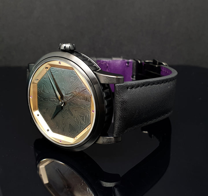 Dial: Hand-formed in Damascus steel and processed for maximum contrast and depth of black