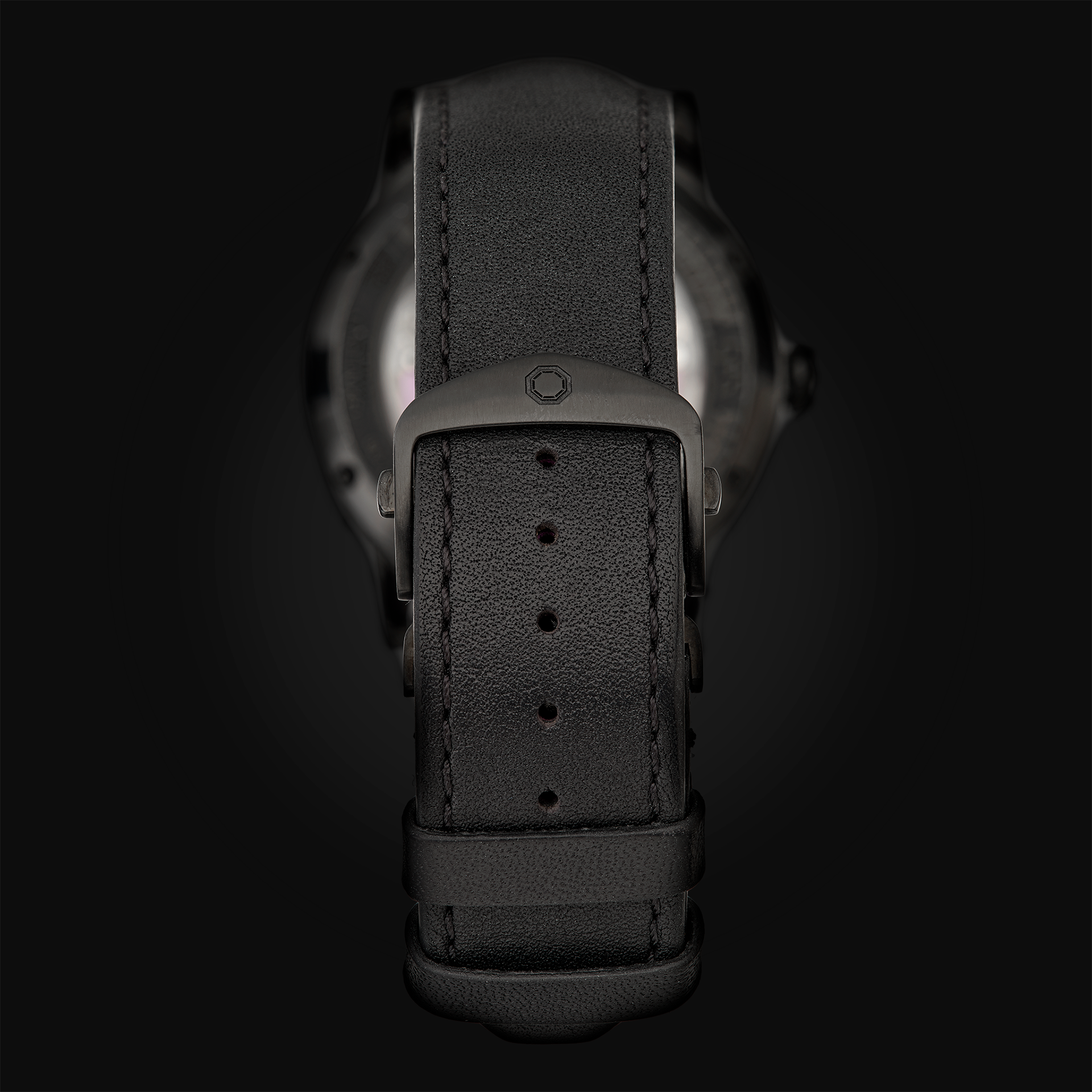 Strap: Hand-stitched salmon leather with 24K gold and a buckle engraved in the shape of an octagon