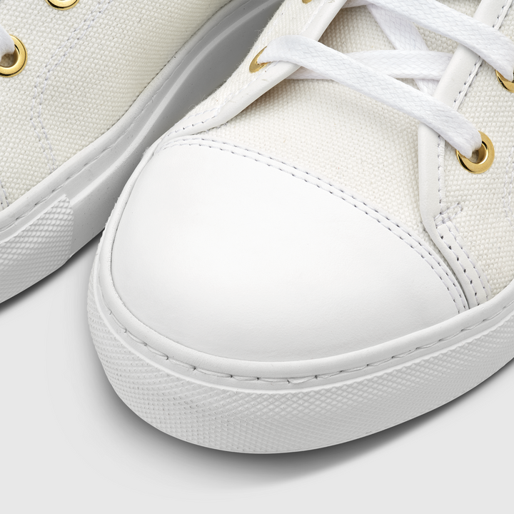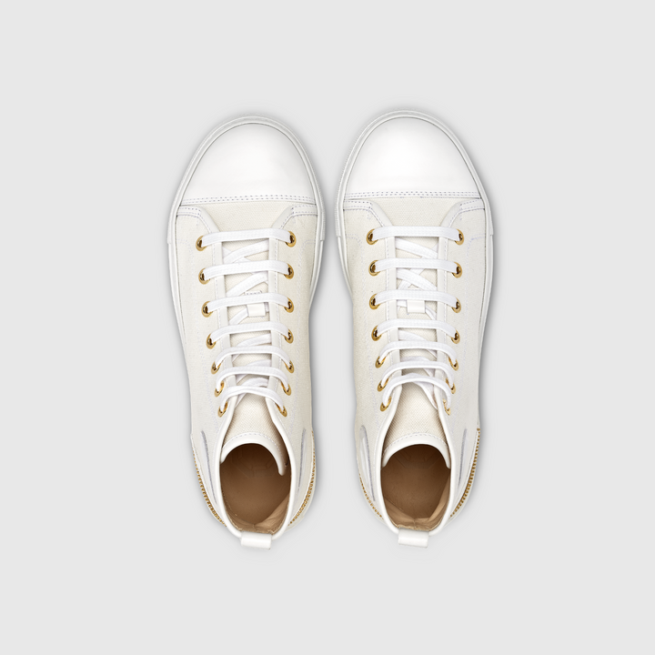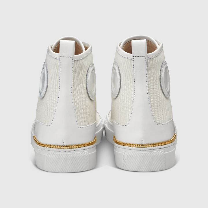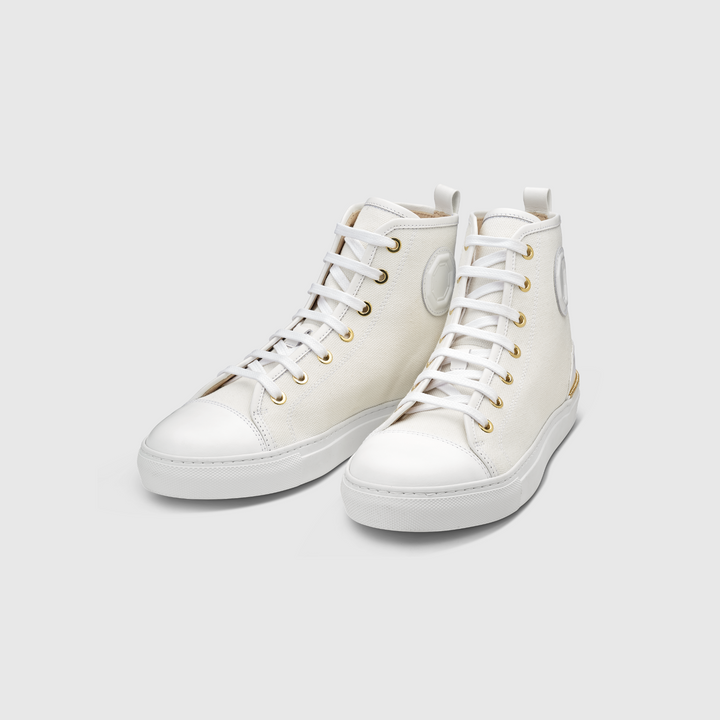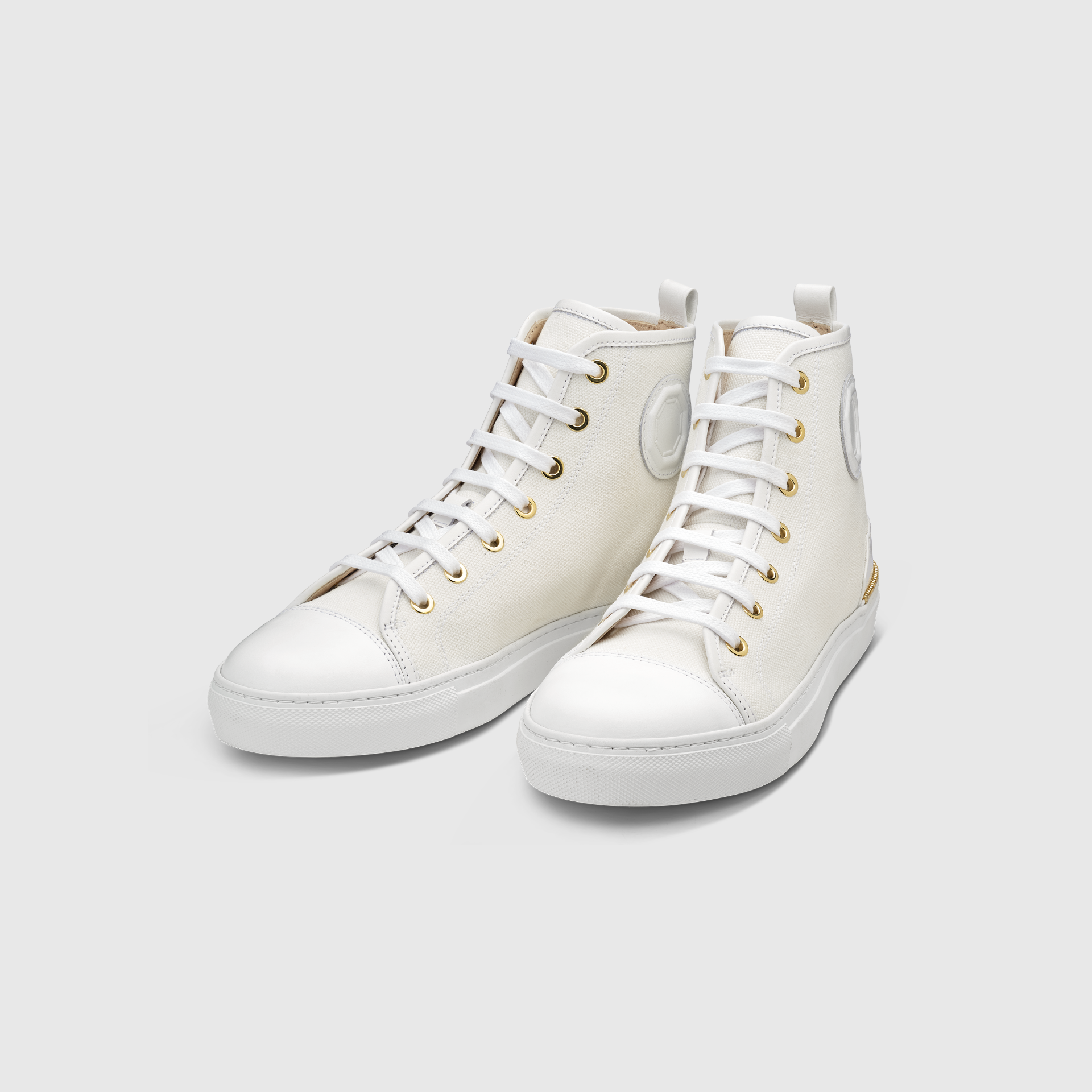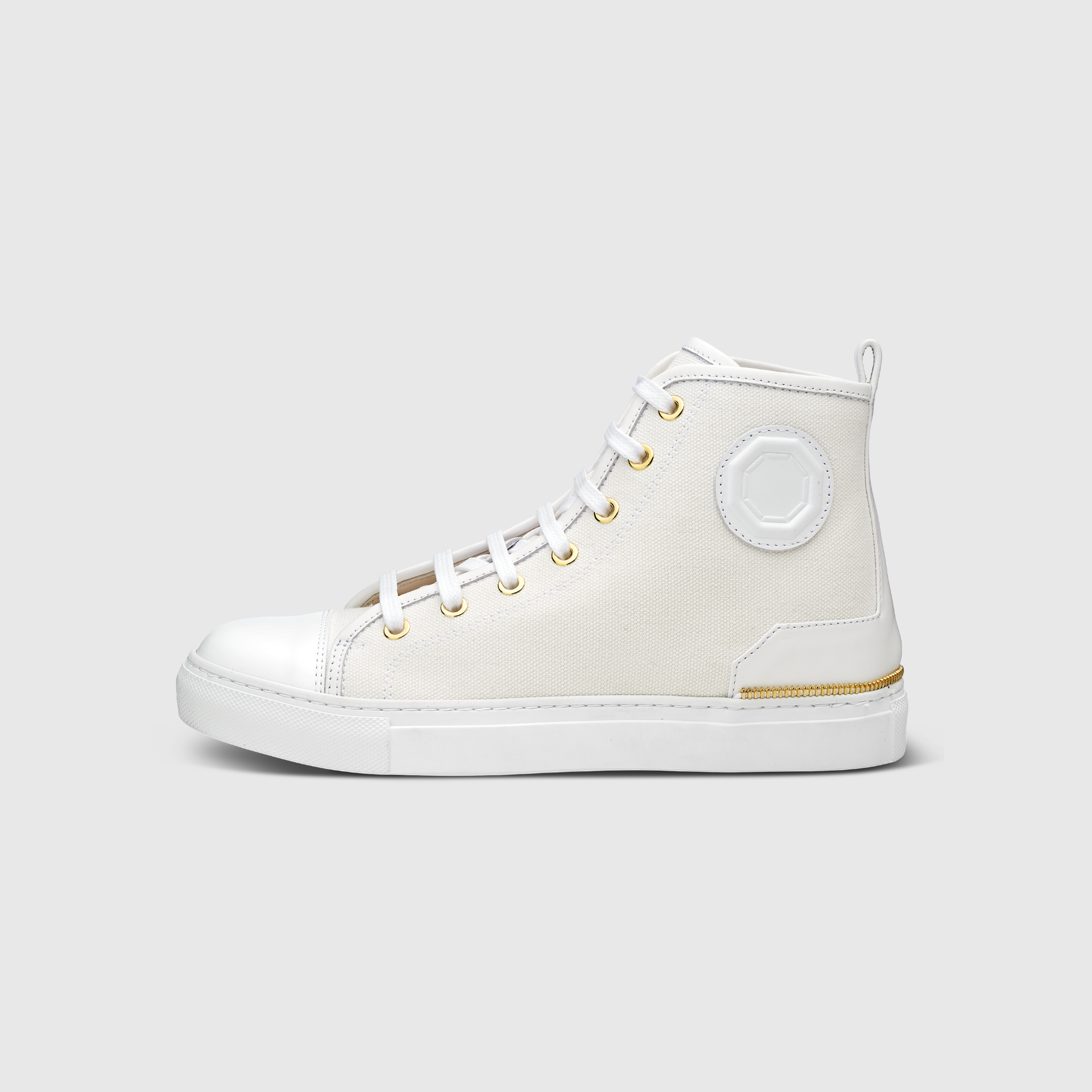High laced sneakers in white canvas and calf leather. Inside with leather and an embossed octagon. Outer sole in white rubber.