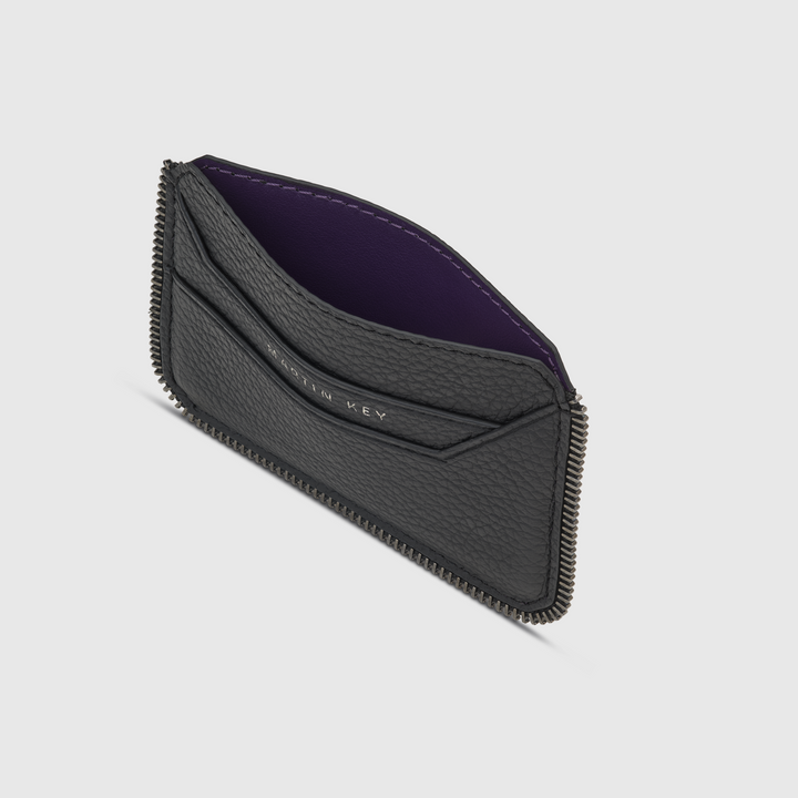 Cardholder in black calf leather and zipper in Gun Metal. The inside of the Cardholder have Martin Key’s signature color, Rock’n’Roll purple.