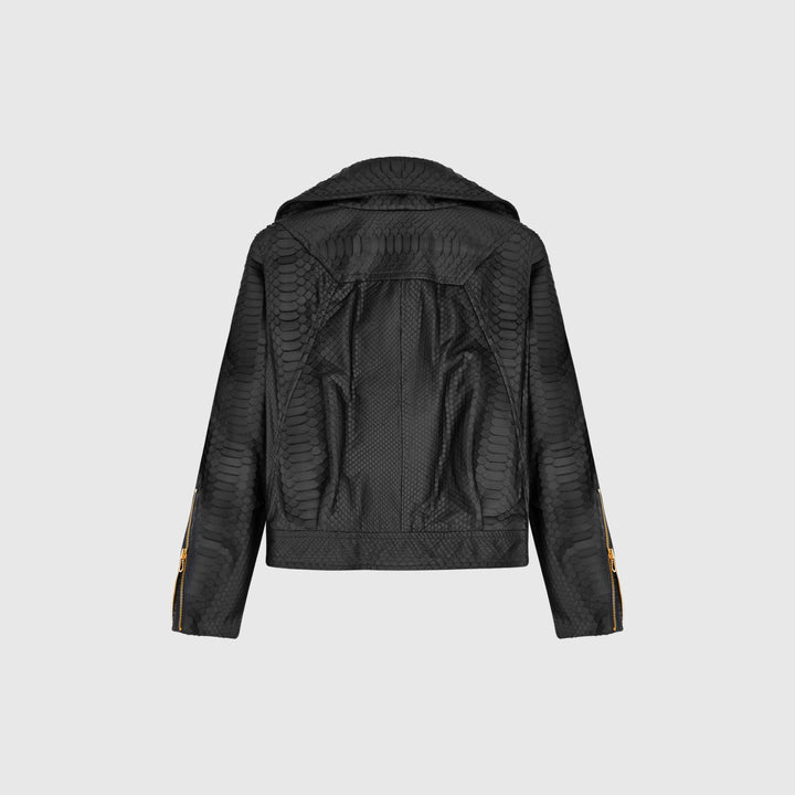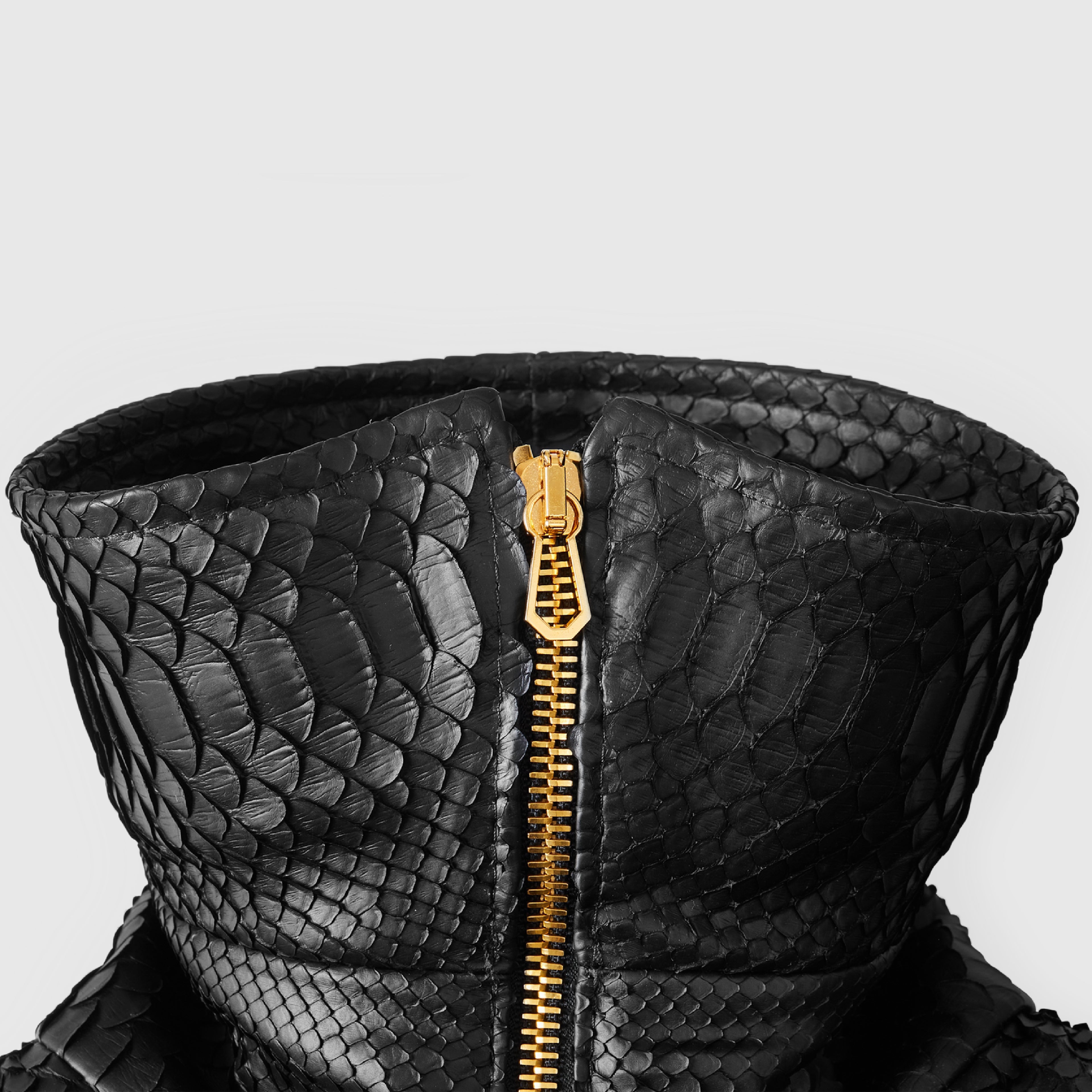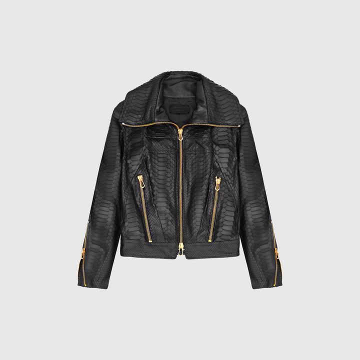 Python leather jacket designed by Lars Wallin. This jacket has a two way zipper adorned with the keyhole that is one of the hallmarks for a Martin Key leather jacket. The jacket have two outer pockets and zippers on each sleeve. The inside of this leather jacket is dressed with black lining, pockets and the octagon shaped name badge.