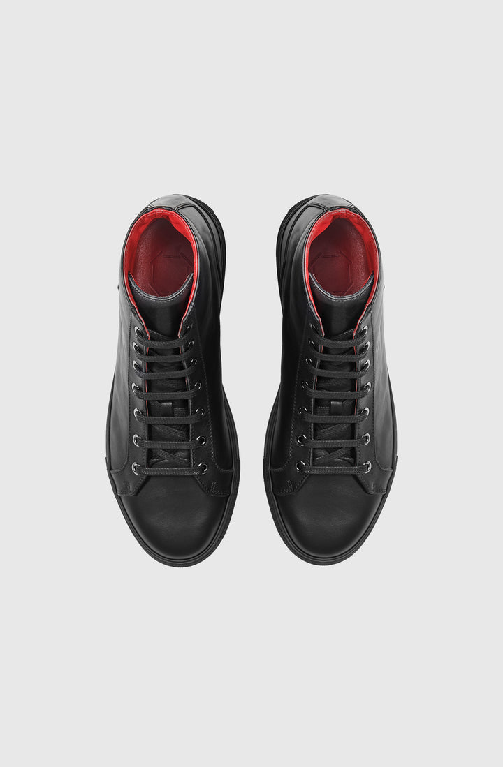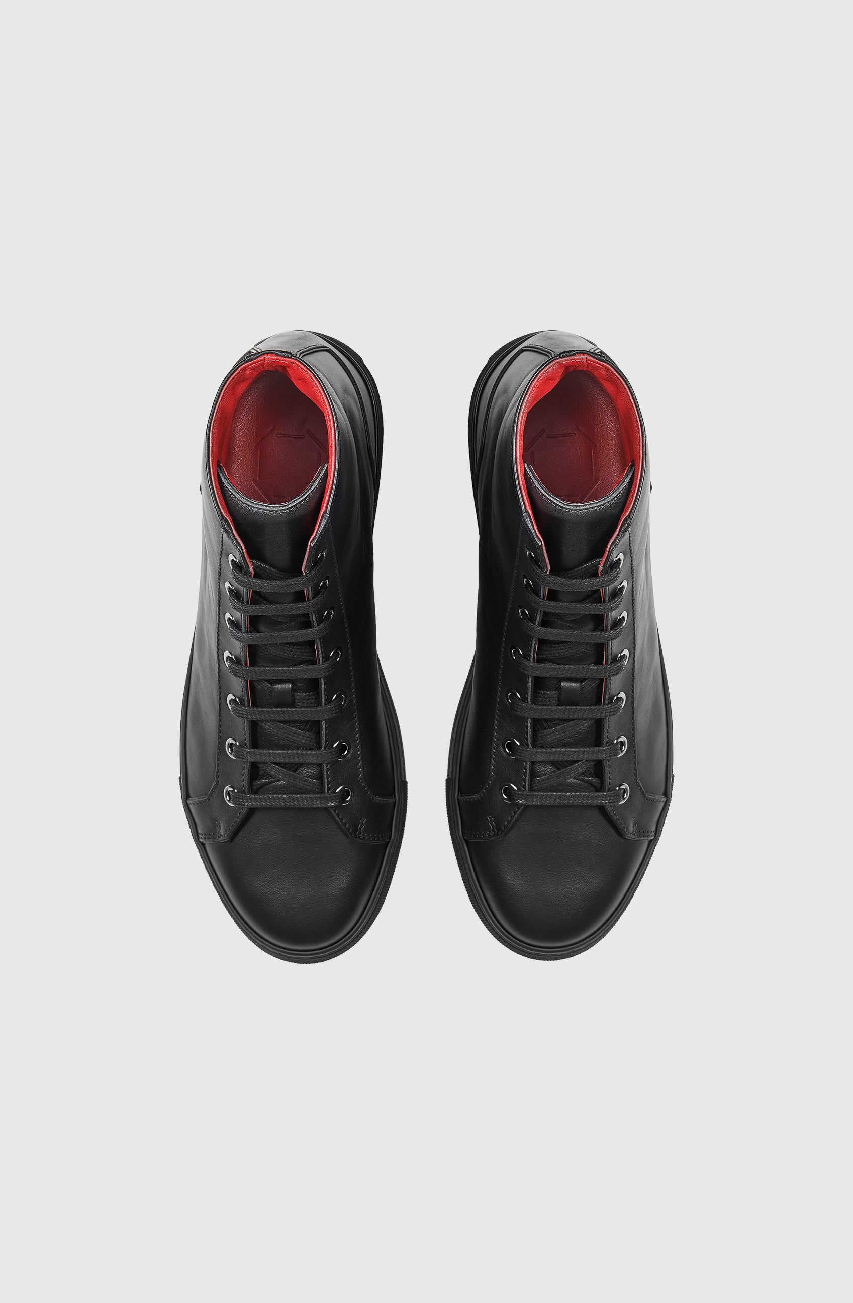 High laced sneakers in black nubuck leather. Inside with red details and an embossed octagon. Outer sole in black rubber.