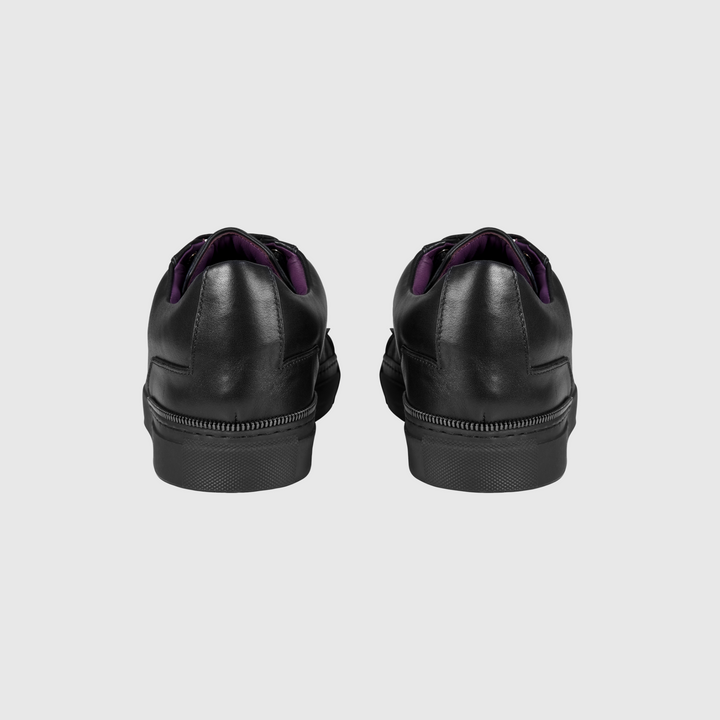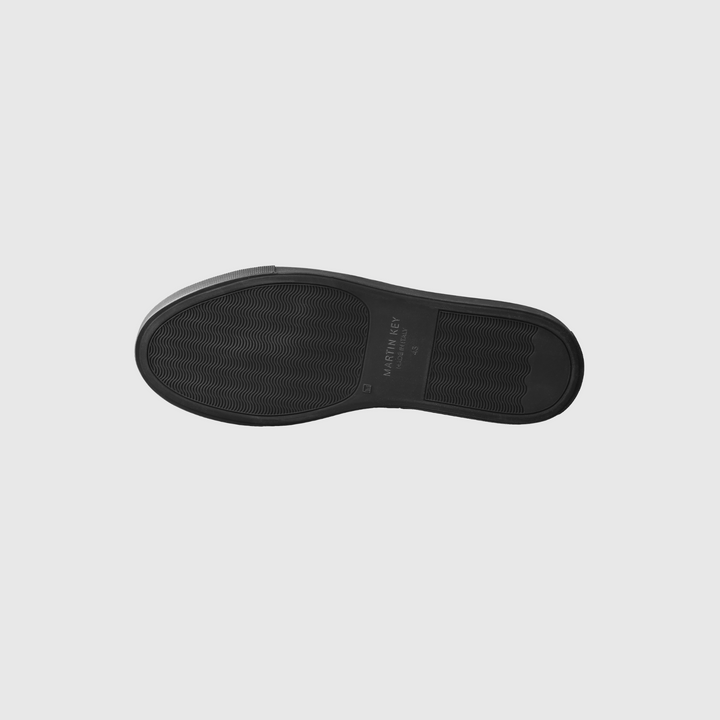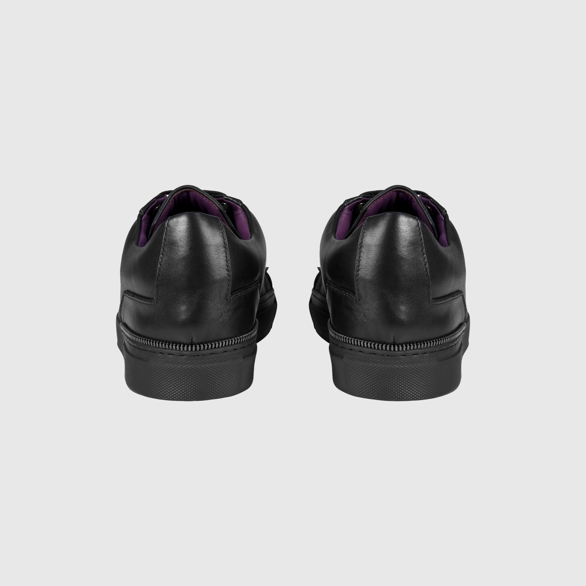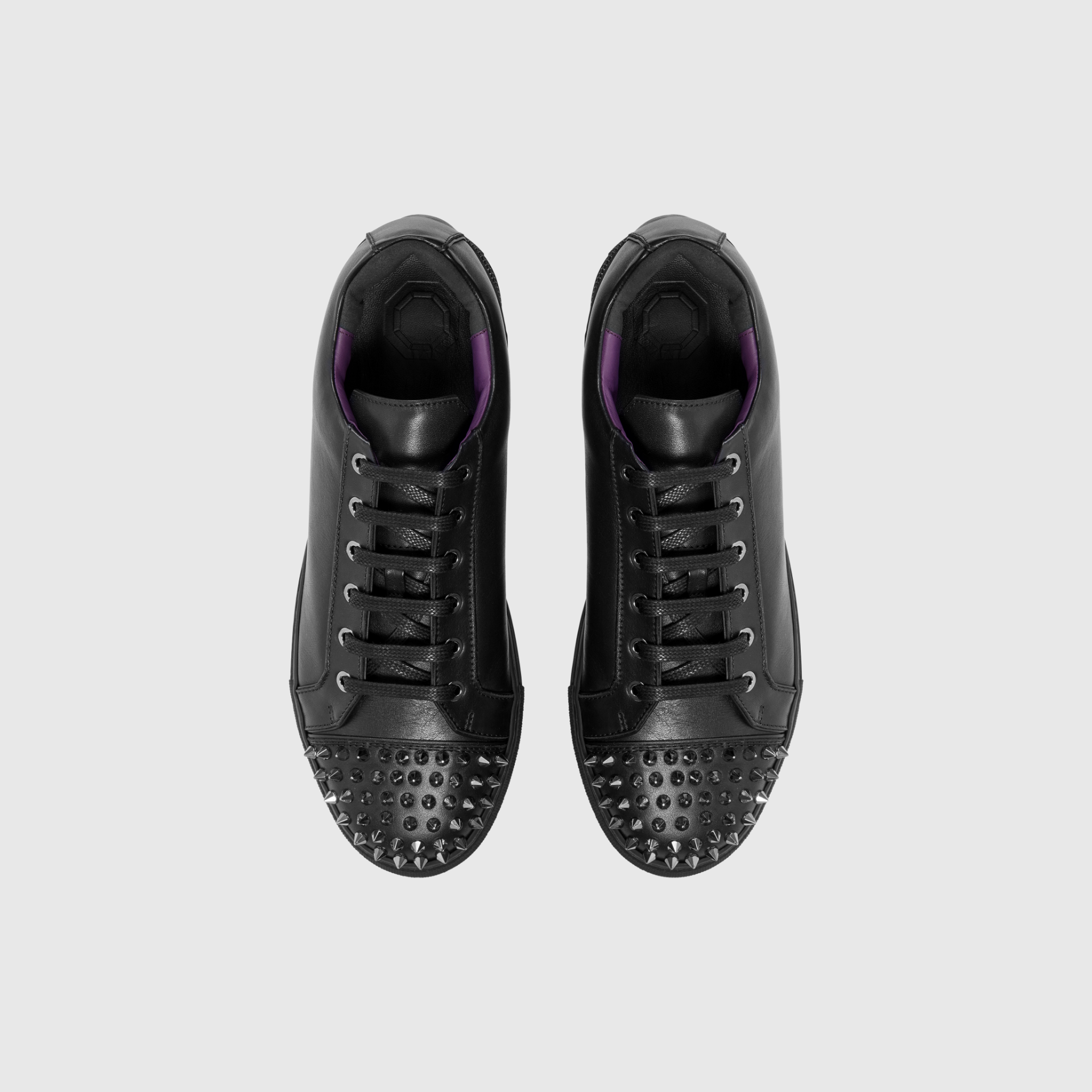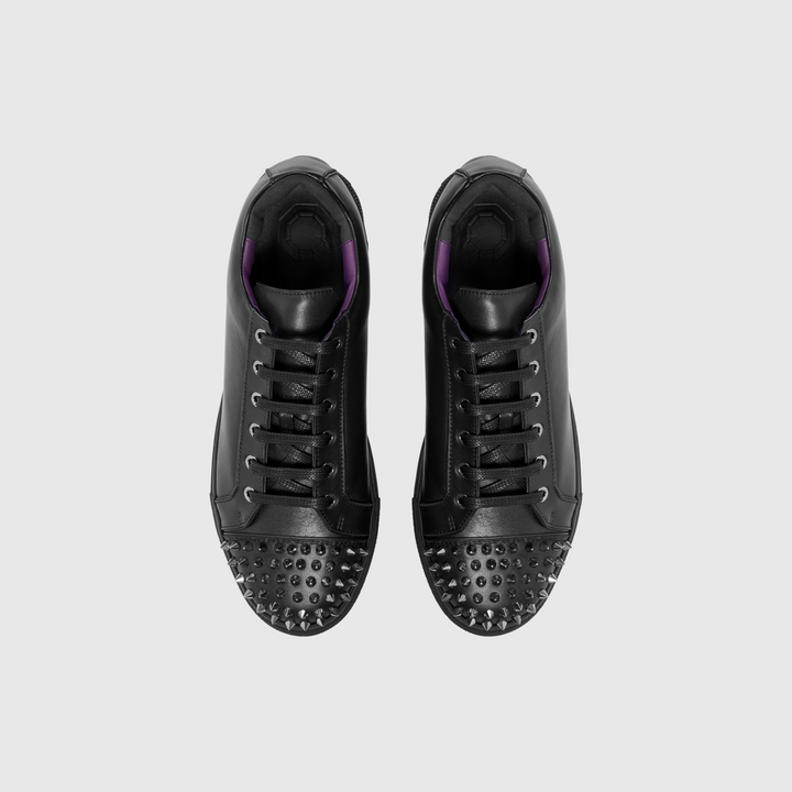 Low laced sneakers in calf leather with studs and zipper. Inside with leather and an embossed octagon. Outer sole in black rubber.