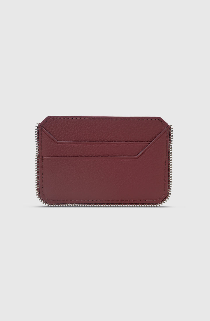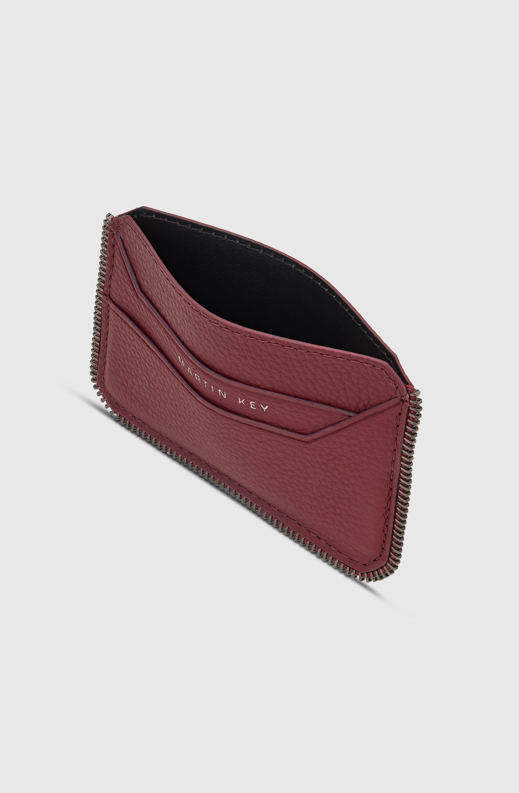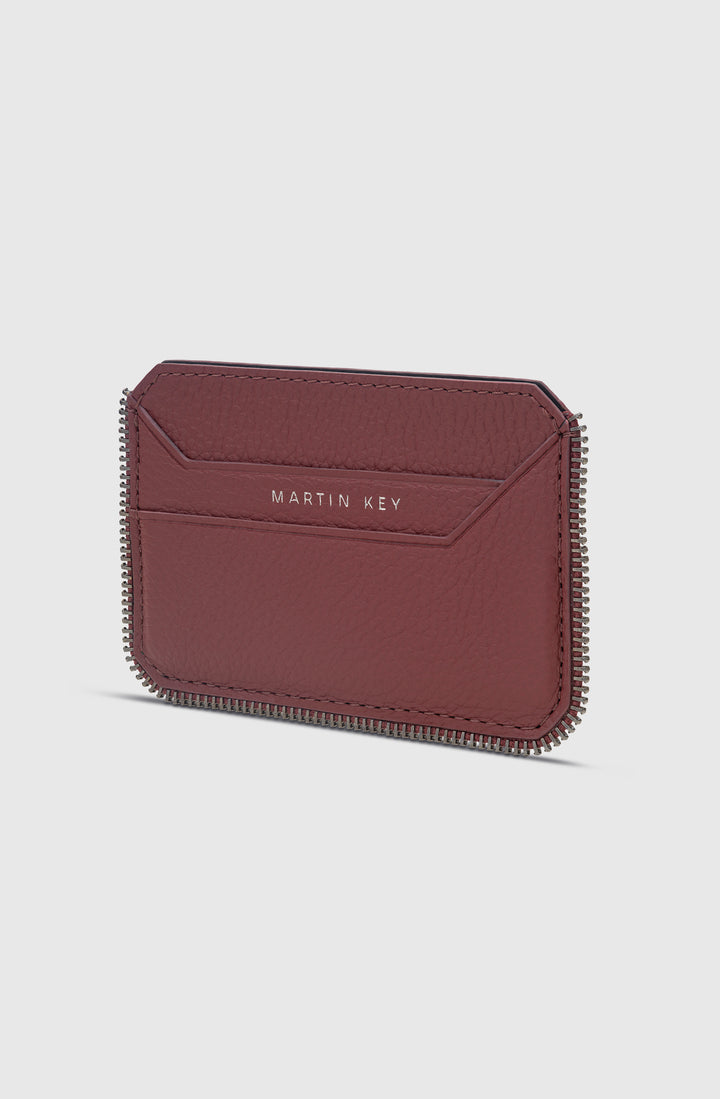 Cardholder in merlot calf leather and zipper in Gun Metal. The inside of the Cardholder have Martin Key’s signature color, Rock’n’Roll purple.