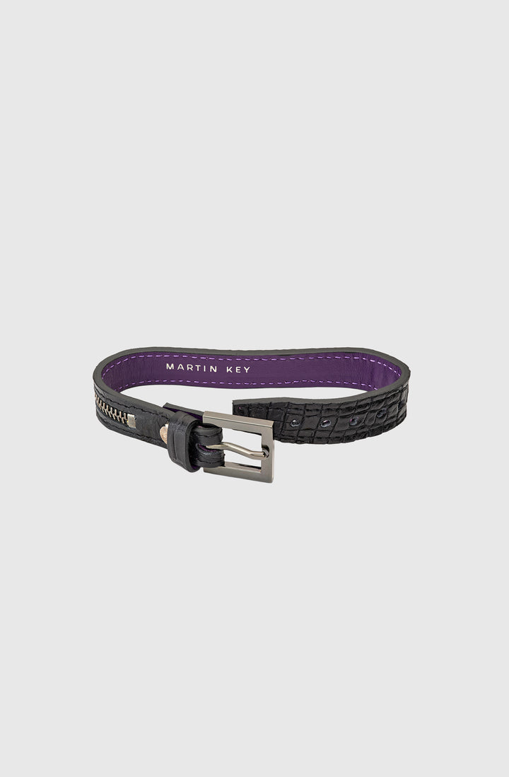 Bracelet in black Crocodile leather and zipper in Gun Metal. The inside of the bracelet have Martin Key's signature color, Rock'n'Roll purple.