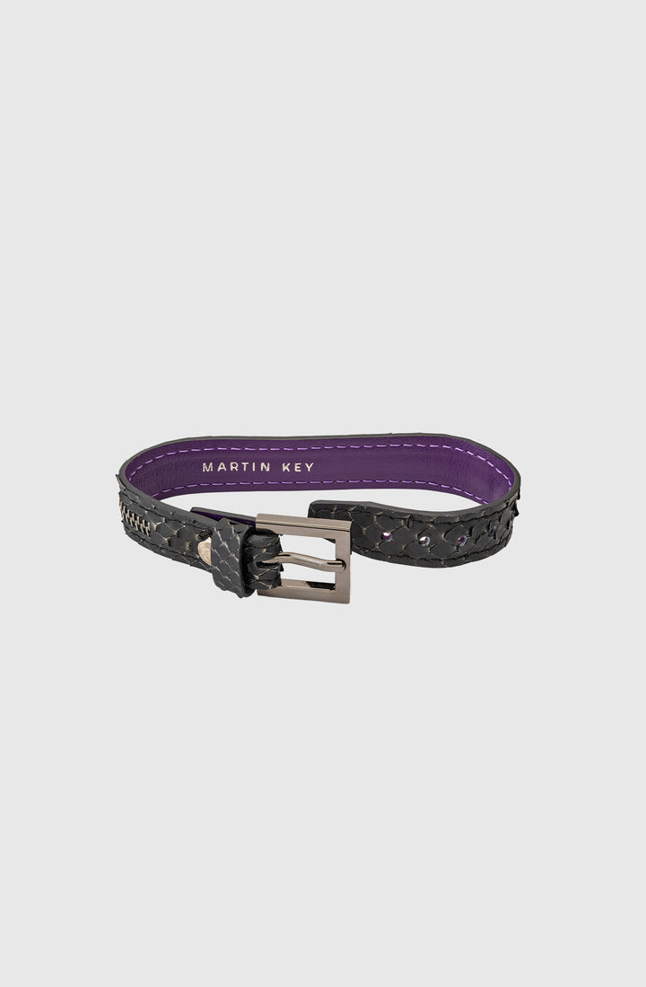 Bracelet in black Python leather and zipper in Gun Metal. The inside of the bracelet have Martin Key's signature color, Rock'n'Roll purple.