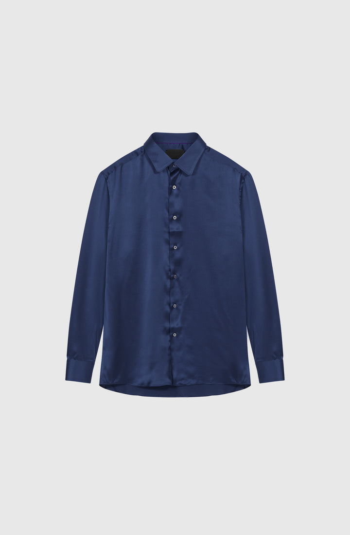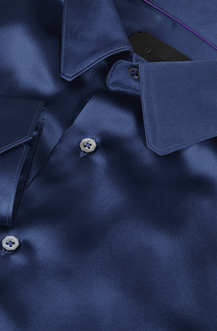 Navy shirt in pure silk with mother of pearl buttons shaped as octagons.