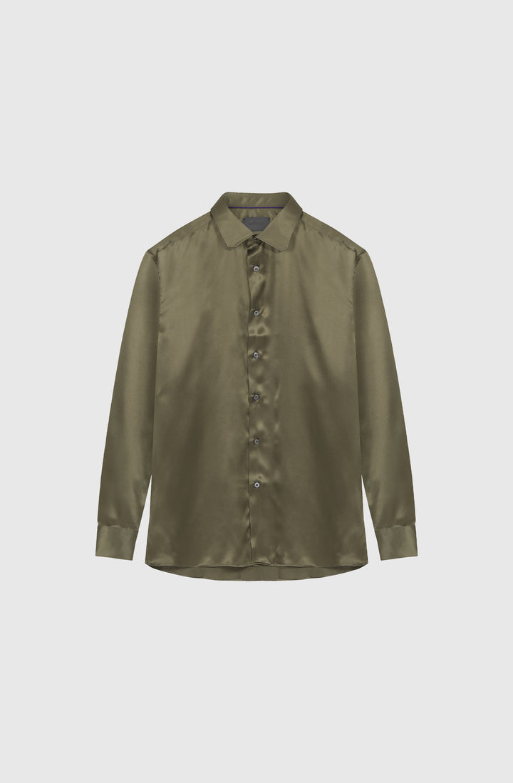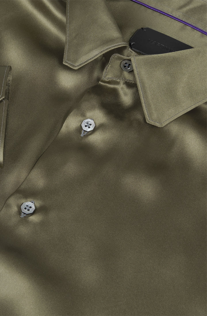Olive shirt in pure silk with mother of pearl buttons shaped as octagons.